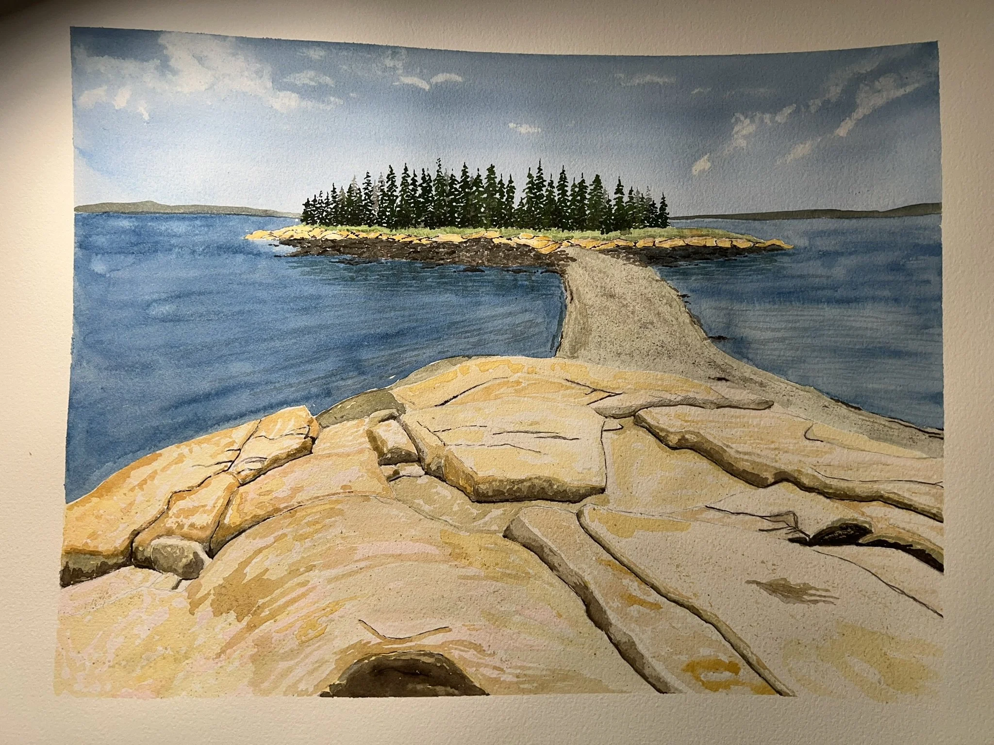 Granite ledges and sand bar exposed at low tide. The smell of seaweed a quick scramble around little island.