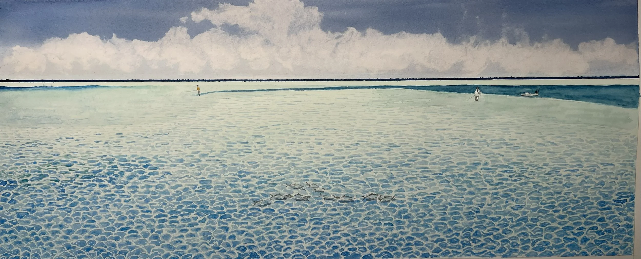 After an A.L. Barnes painting, the anticipation of stalking a flat never gets old. When you see the shadows or nervous water, hope is quick to follow. In the distance a large afternoon thunder head builds up and fish are moving off the turtle grass.
